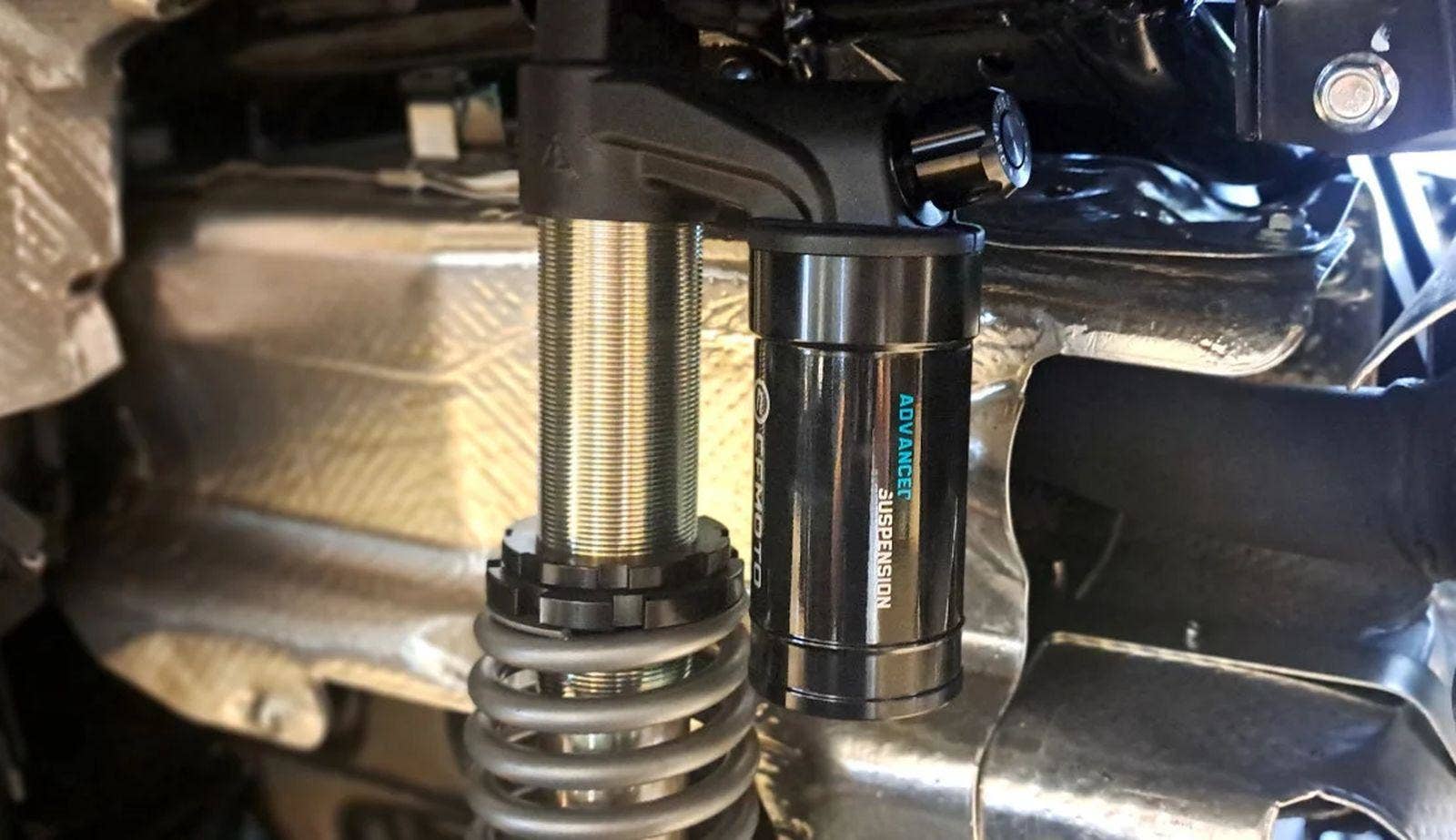 Všechny čtyři tlumící jednotky jsou nitrogenové, s progresivními pružinami, plně nastavitelné, expresně přestavitelné volně rukou ve spodní a vrchní poloze.