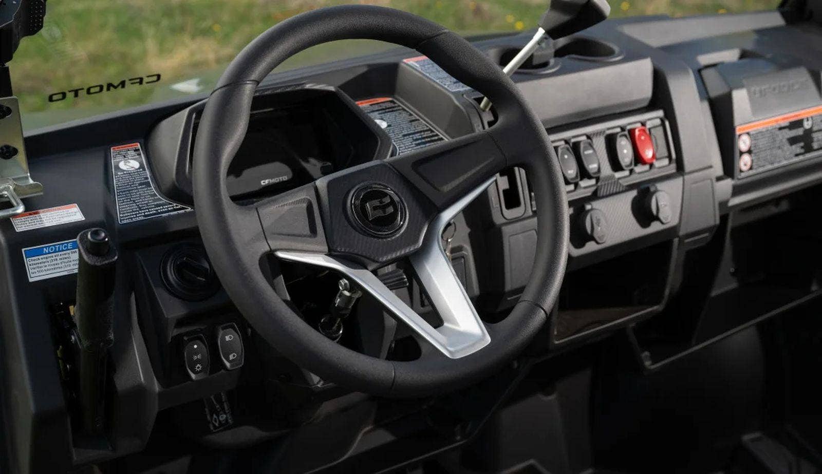 Kromě přepínače jízdních režimů je v kabině ještě nová palubní deska s inovovaným displejem, který přehledně zobrazuje všechny informace, co potřebujete. Na první pohled je naopak vidět nový design, který vychází ze současných trendů CFMOTO. Jsou tu nové LED světlomety vpředu i vzadu a ostřejší maska. Co naopak chybí, jsou pevné dveře. Ty nahrazují sítě, ale v rámci kategorie to není nic neobvyklého. Nově řešená je i střecha UTV, která má systém "okapů", které odvádí při dešti vodu správným směrem, a na jezdce, ani do kabiny neprší. Je tu pochopitelně i možnost osadit UTV kompletní střechou. I nová generace UTV je homologována pro dva jezdce, čemuž odpovídá i komfort kabiny. Díky absenci třetí sedačky je tu dost místa i pohodlí a nechybí ani odkládací schránky. Sedačka řidiče je navíc nově nastavitelná.