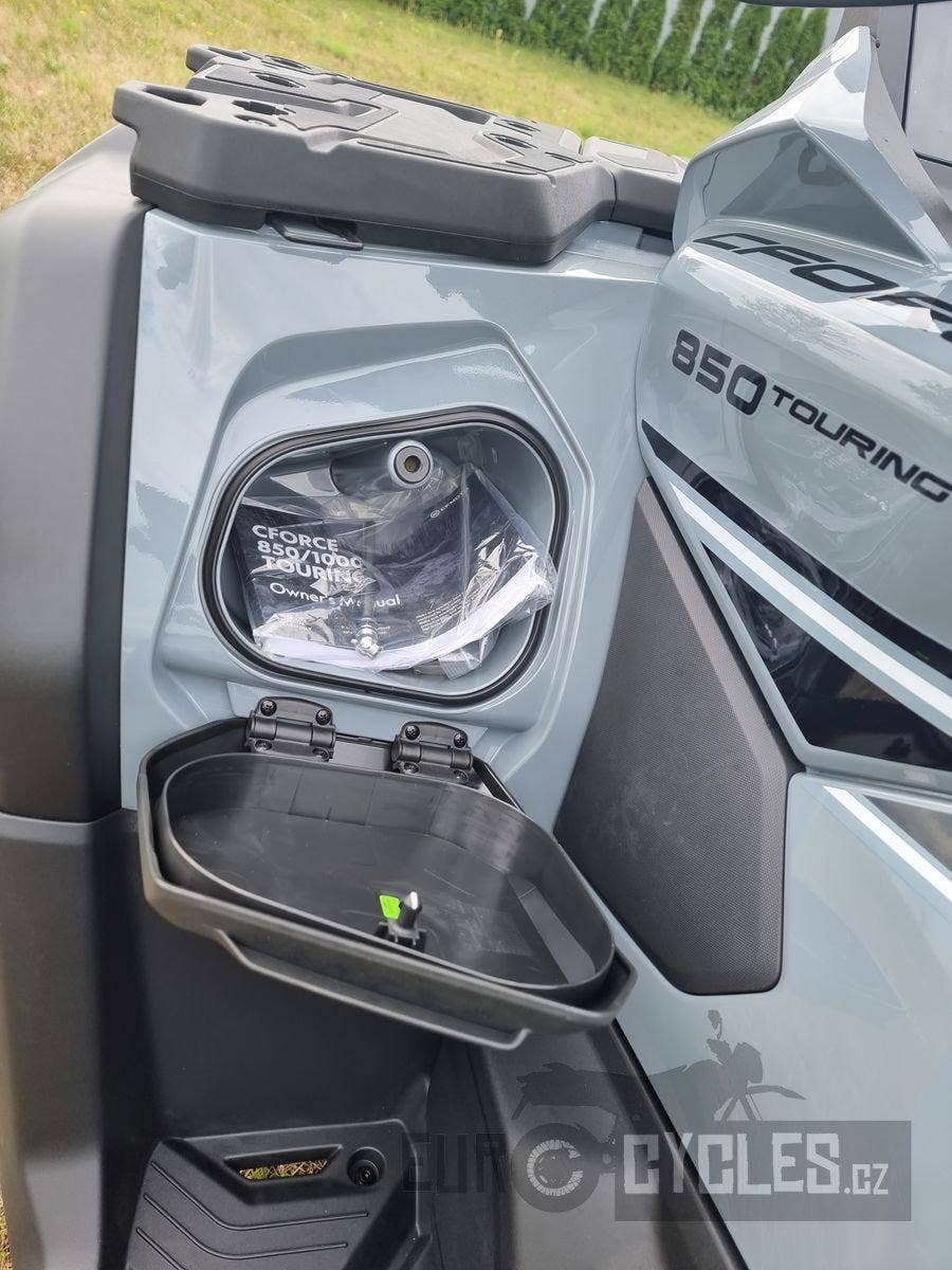 T-Box (volitelné) umožňuje propojení s chytrým telefonem přes aplikaci CFMOTO RIDE, což znamená okamžitý přístup k palubním údajům v reálném čase např.: množství paliva, stav baterie, záznam o jízdě, samodiagnostika vybraných základních funkcí před jízdou
