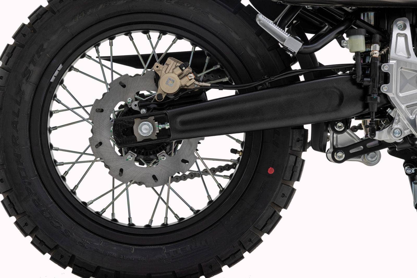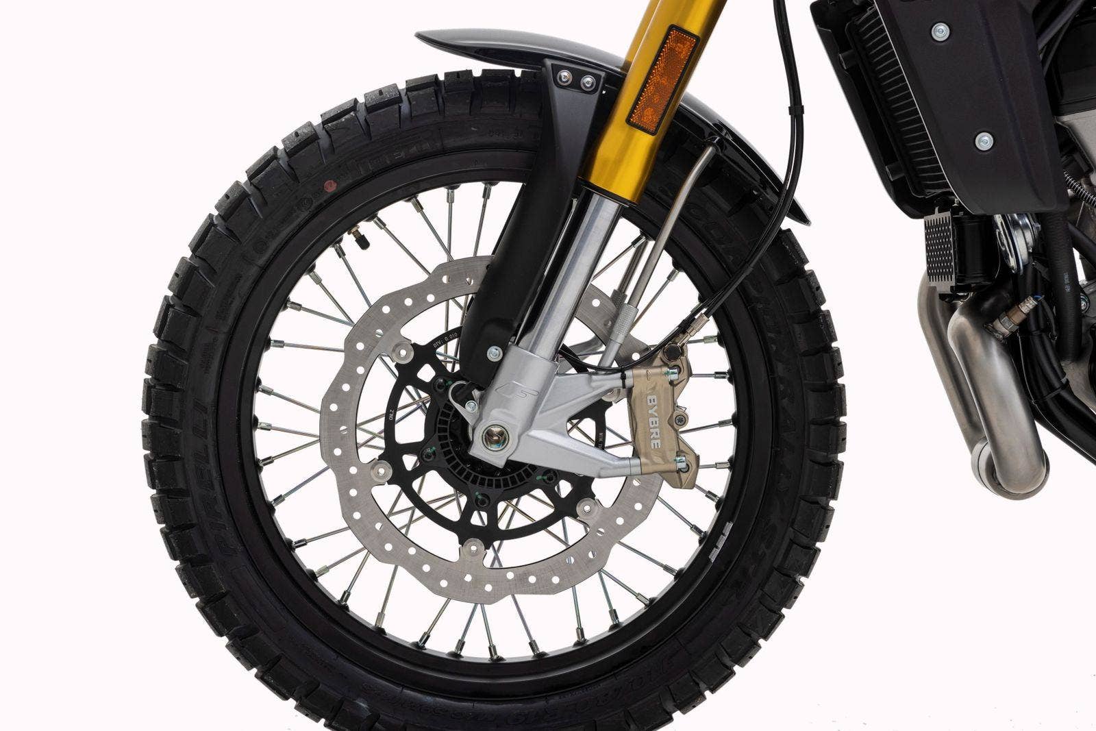 Drátová kola s pneumatikami Pirelli Scorpion Rally (110/80-19 vpředu a 140/80-17 vzadu) dodávají motocyklu autentický scrambler vzhled. 320 mm přední plovoucí a 230 mm zadní brzdový kotouč a nastavitelné náklonové ABS s kontrolou trakce zaručují skvělou bezpečnost v každé situaci.