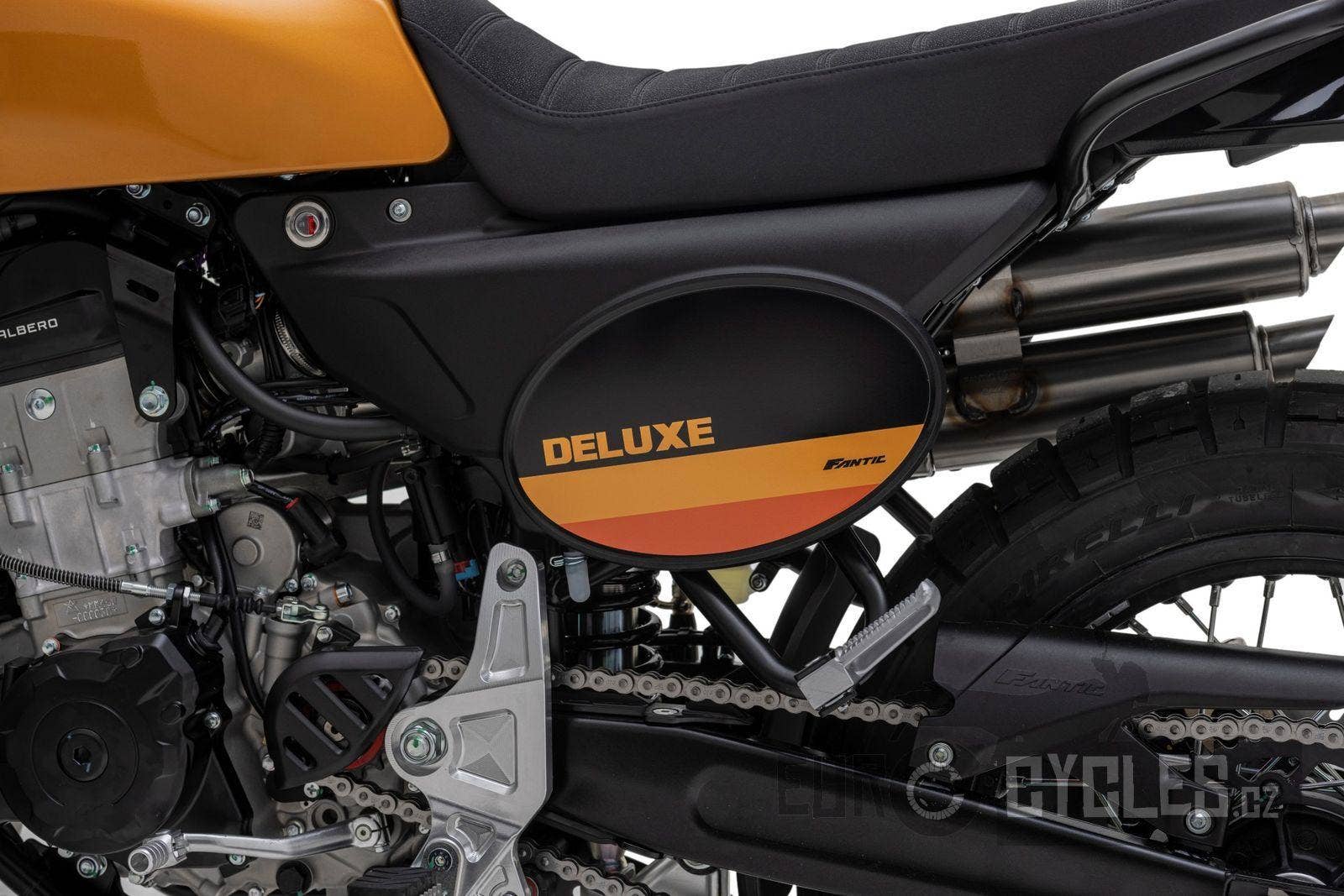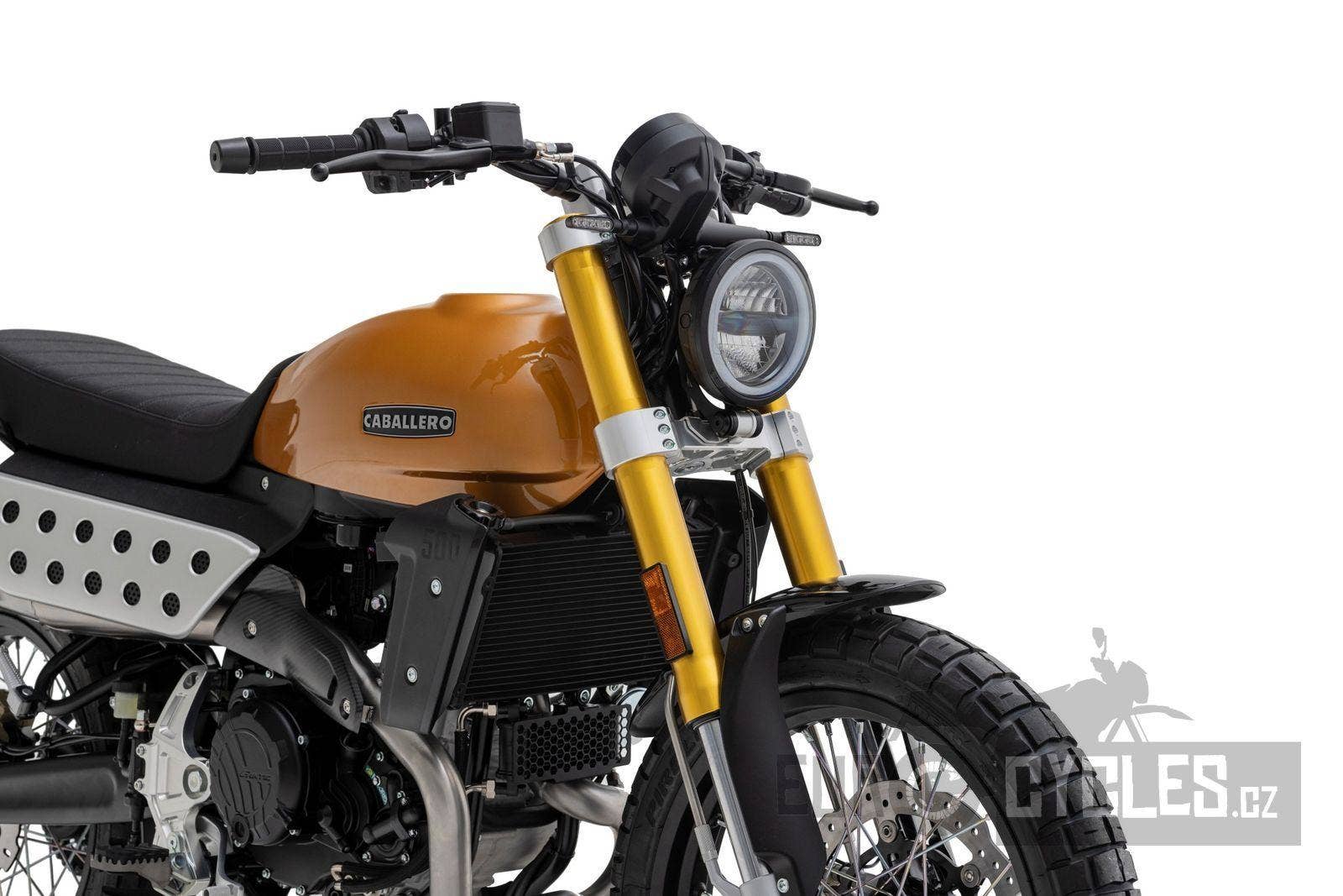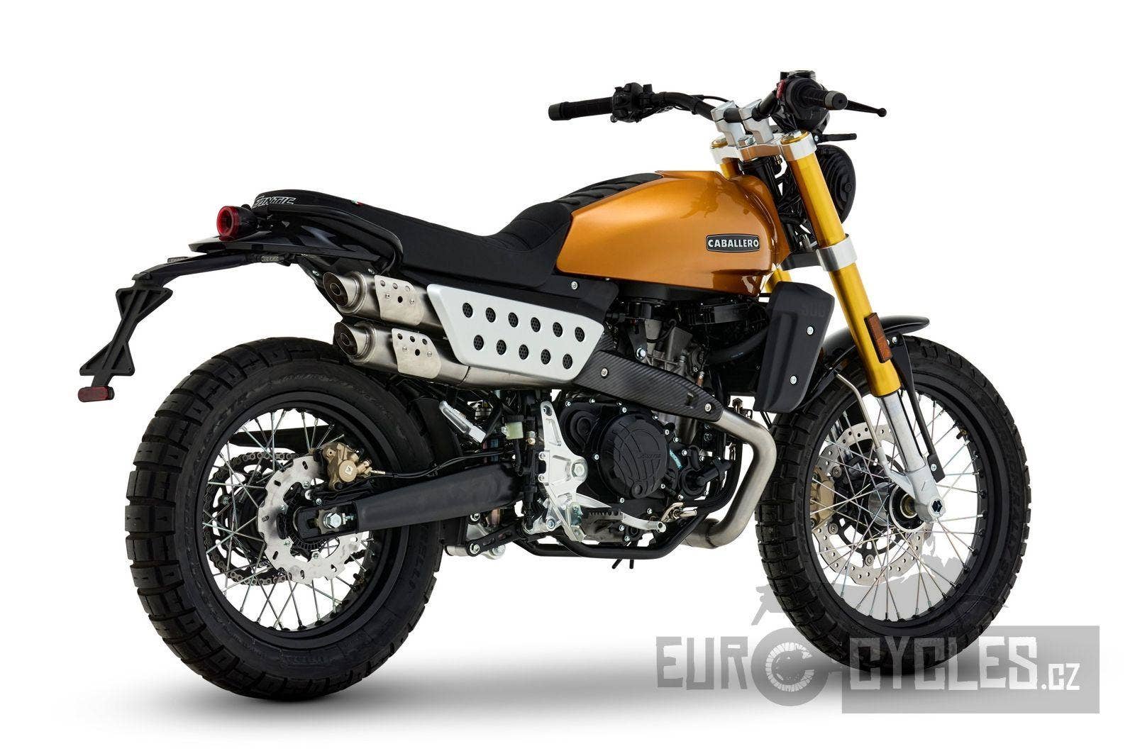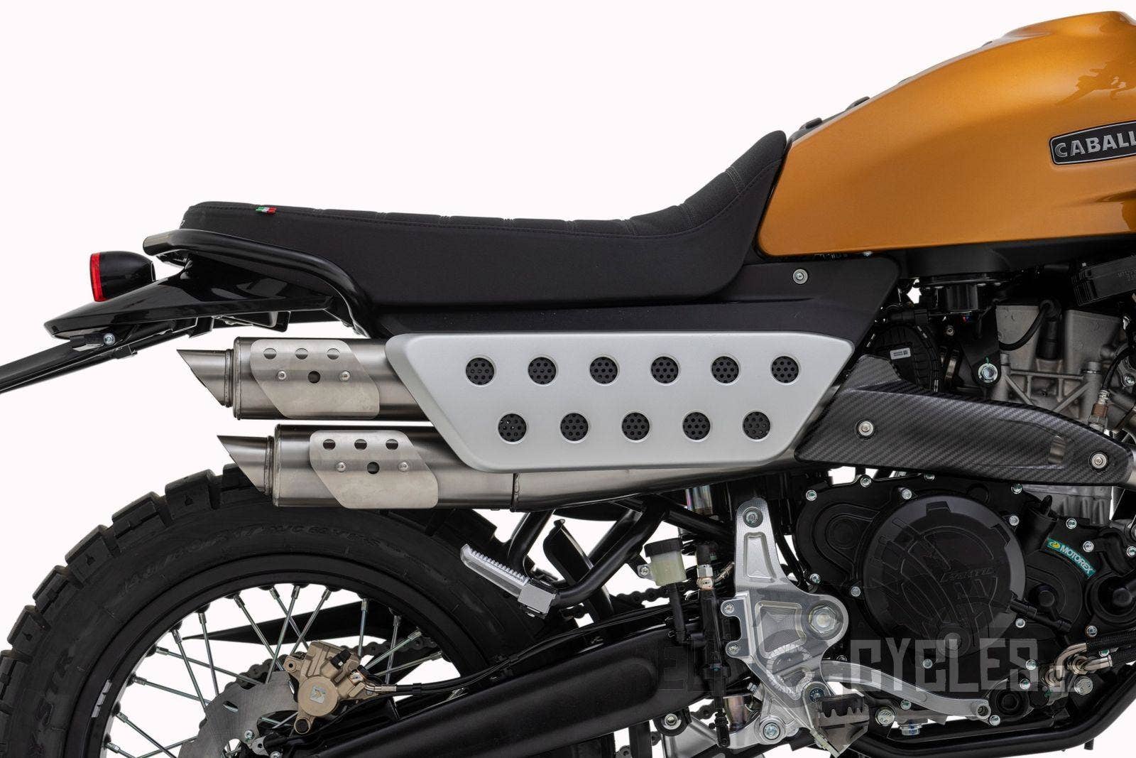 Luxusně lakovaná palivová nádrž a kontrastní boční závodní tabulka inspirovaná ikonickým Fantic Motor Caballero ze 70. let. Široká řídítka s off-roadovým tvarem, dvojitý výfukový systém od Arrow, mnoho CNC detailů, designová přední a zadní LED světla, maximum součástí zakázkově vyráběných v Itálii, to vše dělá z Caballera neodolatelnou hračku pro jezdce všech generací.