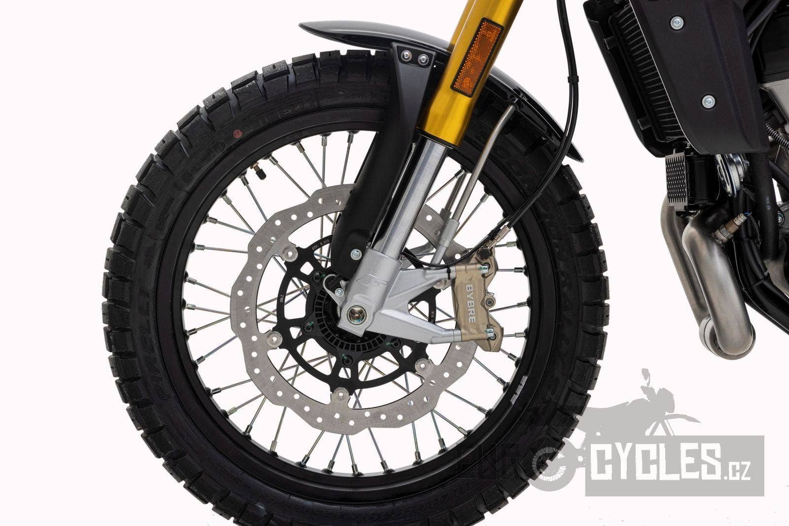 Drátová kola s pneumatikami Pirelli Scorpion Rally (110/80-19 vpředu a 140/80-17 vzadu) dodávají motocyklu autentický scrambler vzhled. 320 mm přední plovoucí a 230 mm zadní brzdový kotouč a nastavitelné náklonové ABS s kontrolou trakce zaručují skvělou bezpečnost v každé situaci.