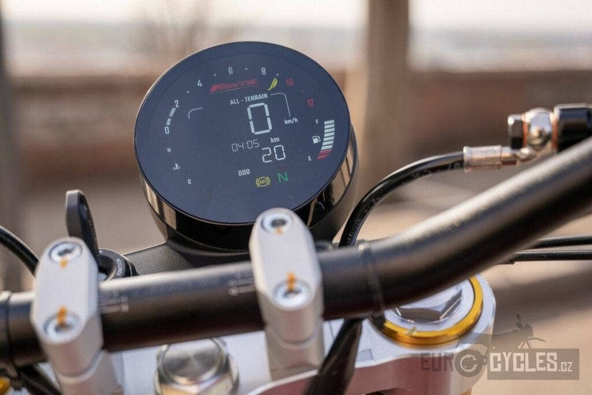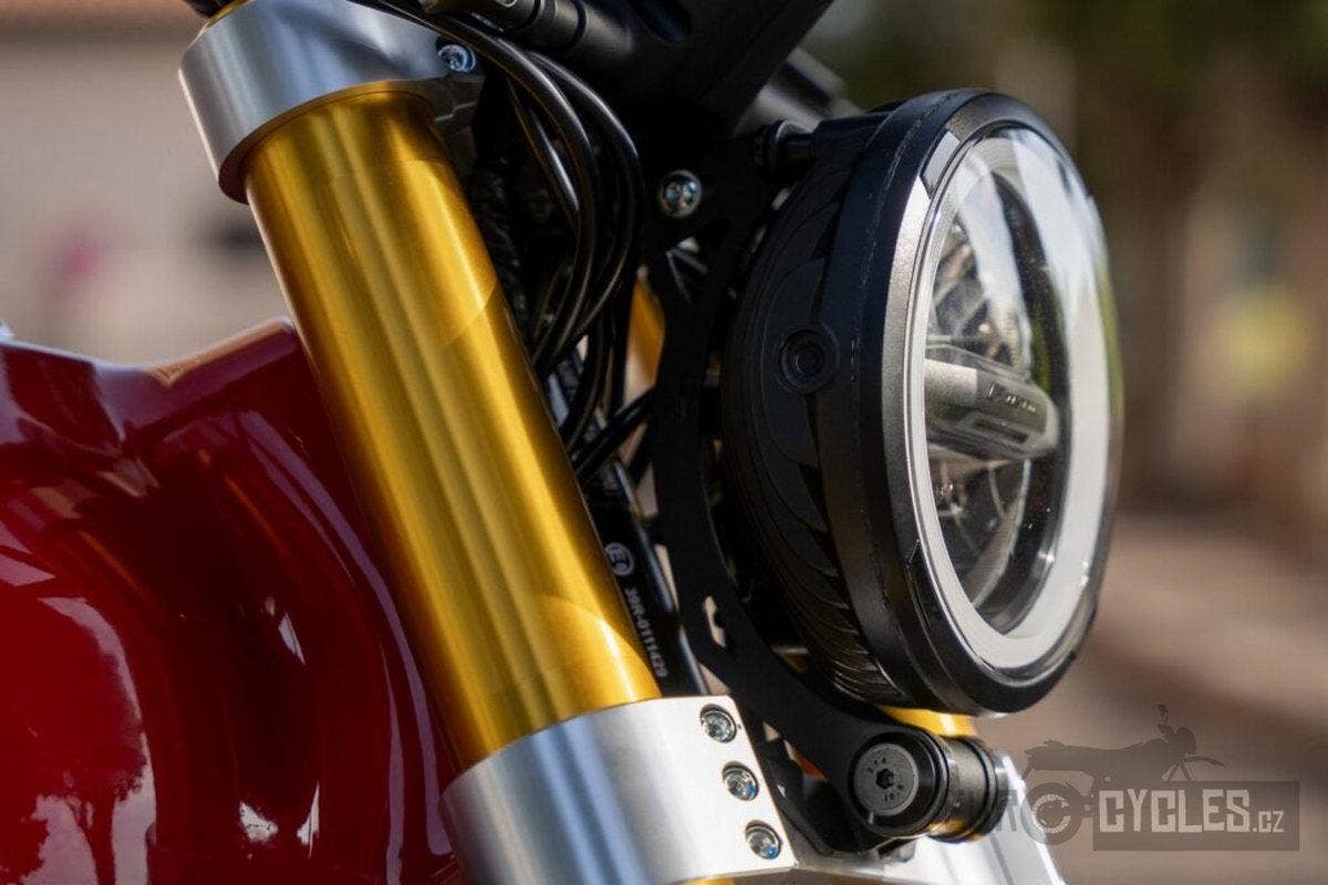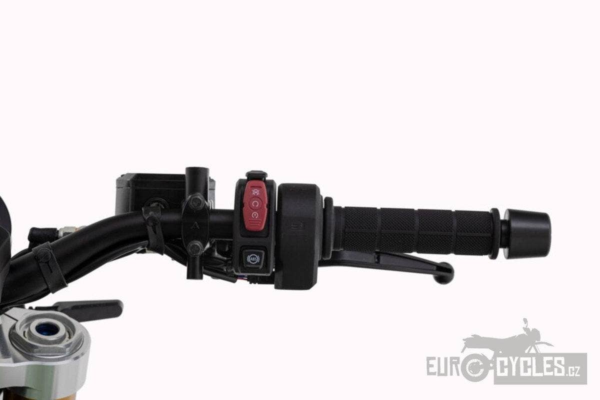 Design inspirovaný 70. lety, barevná nádrž, závodní tabulky, široká řídítka, Arrow výfuk, CNC detaily a LED světla vytváří unikátní styl.