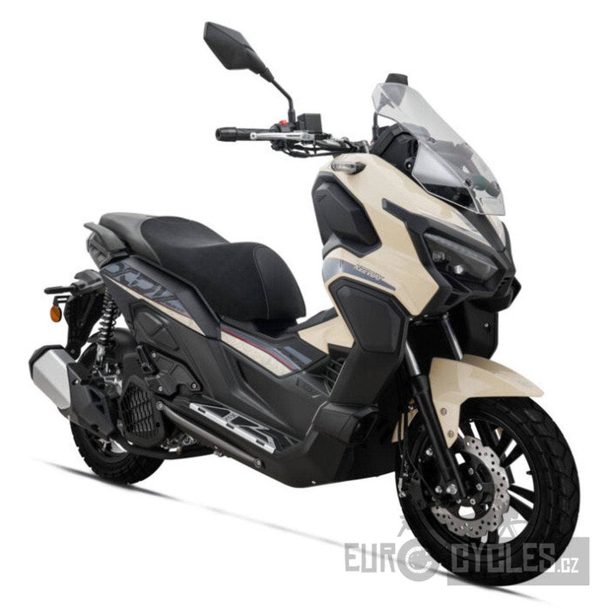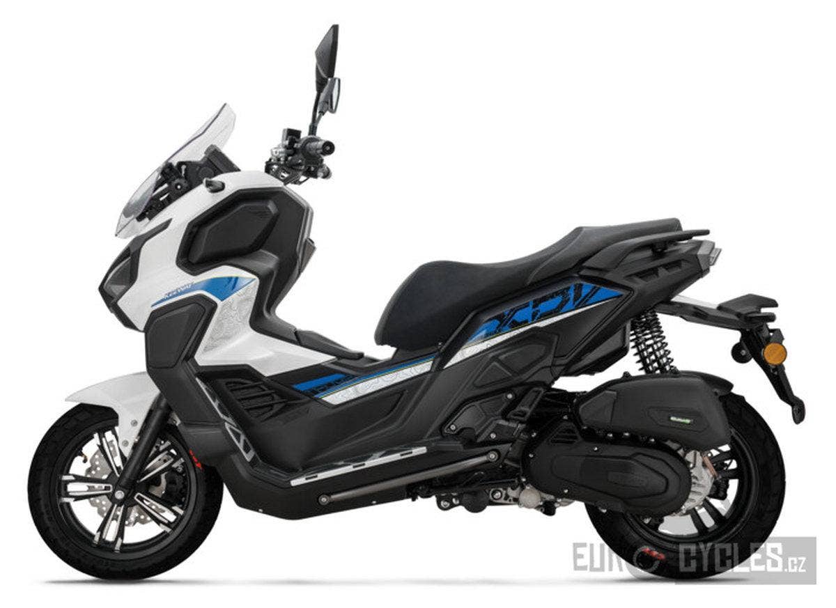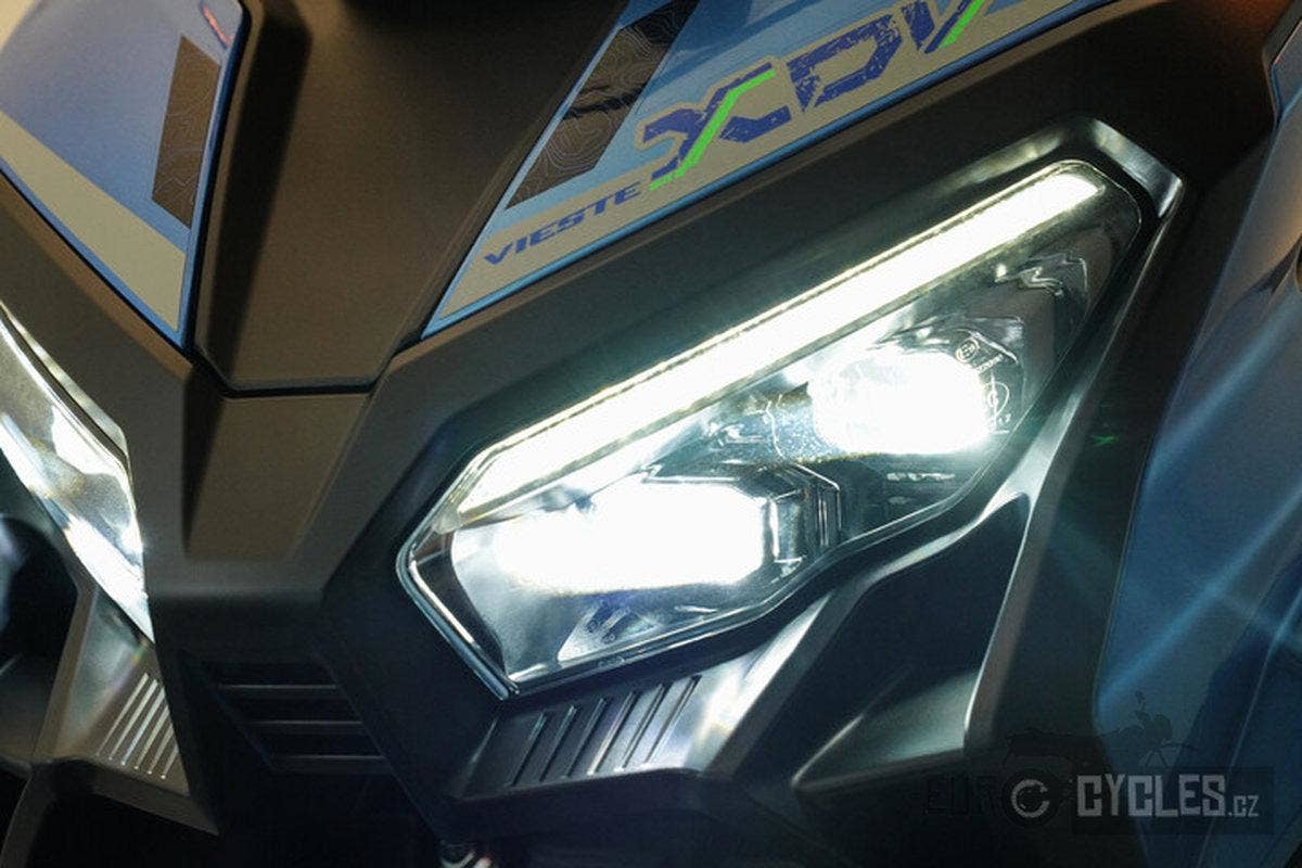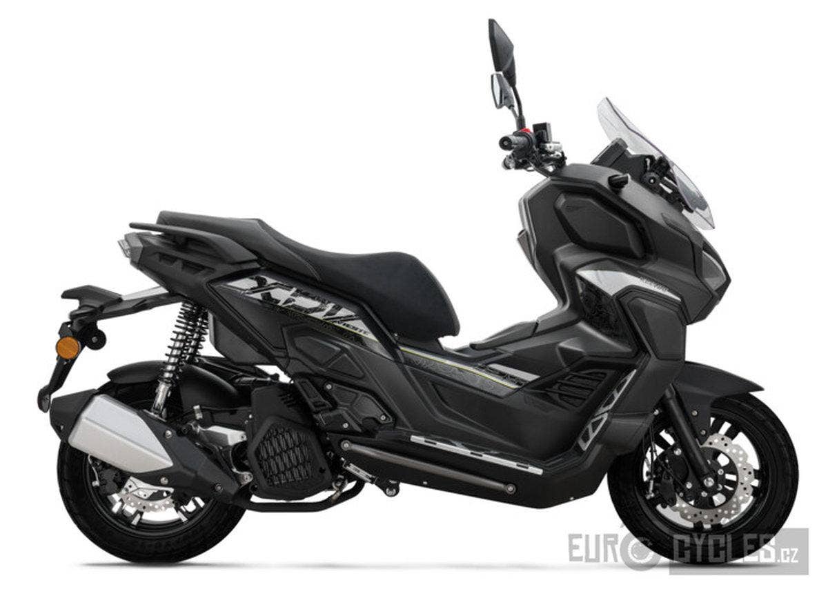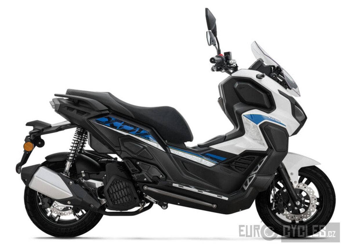 Dobrodružný skútr Vieste 125XDV zvládne každou cestu. Robustní konstrukce tohoto modelu, který zdaleka přesahuje průměrný skútr, je vybavena duálními silničními pneumatikami a citlivým odpružením, které umožňuje snadné překonávání různorodého terénu ve městě i daleko za jeho hranicemi. Tento pokročilý maxiskútr odlišují celohliníkové nášlapné stupačky a nastavitelné čelní sklo.