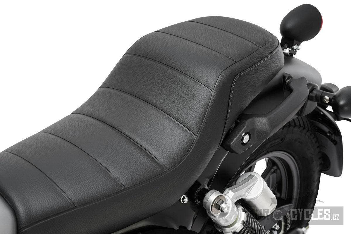 Klasický výfuk ve stylu cafe racer se nachází ve spodní části podvozku s mírně zkoseným úhlem a stříbrným tepelným štítem.