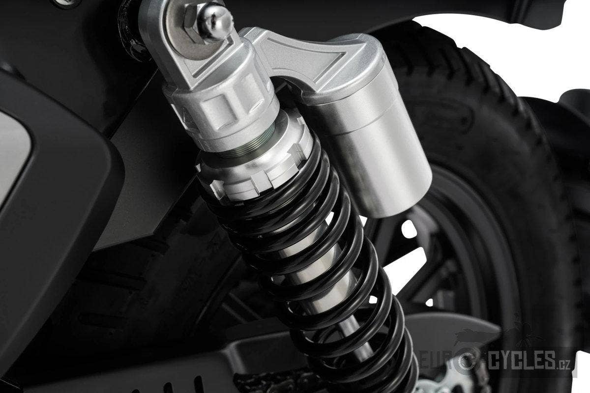 Dvojitý tlumič s pětistupňovým nastavením předpětí, který tlumí nerovnosti na silnici.