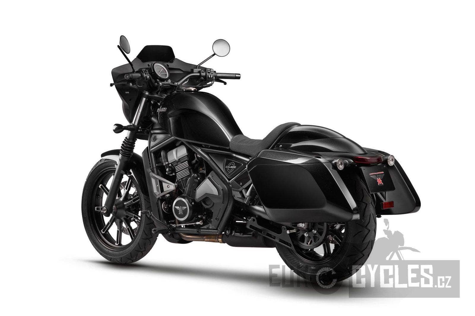 Calibro Bagger je model určený pro ty, kteří hledají nezaměnitelný a působivý styl. Cruiser s pevnými bočními kufry o objemu 19 l a přední maskou ve tvaru netopýřích křídel v základní výbavě.