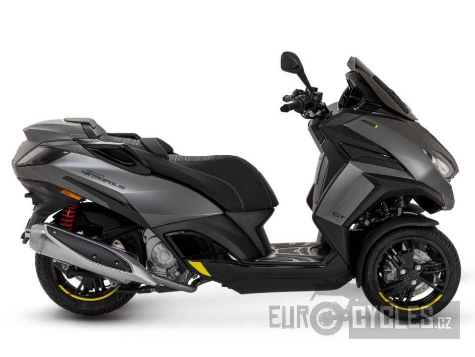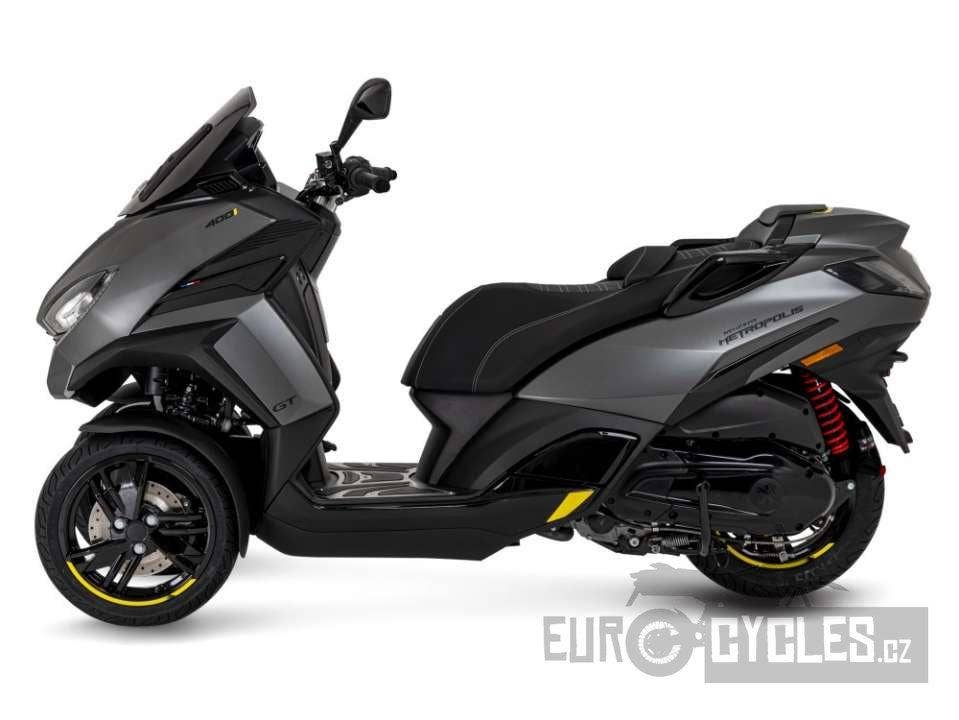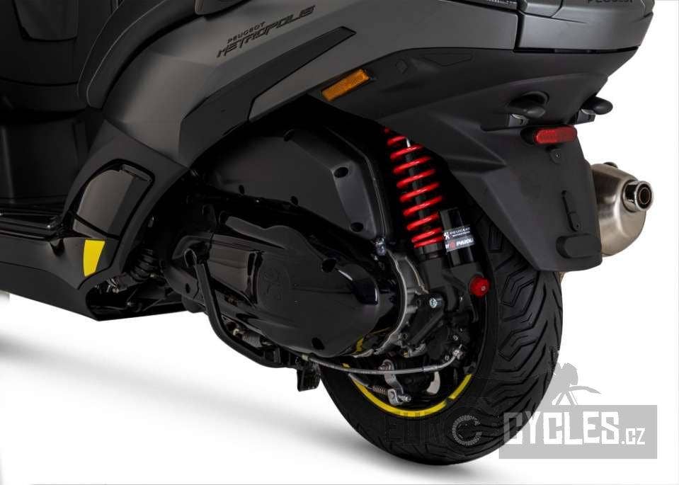 Po technické stránce tu máme speciálně vyvinutý motor Peugeot PowerMotion 400i s výkonem 26,2 kW a maximálním točivým momentem 38,1 Nm, který nastupuje už při 5 750 otáčkách za minutu. Díky tomu je jízdní projev Metropolisu velice dynamický. Výkon pomáhají krotit spolehlivé kotoučové brzdy s kombinovaným systémem ABS a SBC a samozřejmě také pečlivě odladěný podvozek s promyšleným systémem zavěšení předních kol, který vás bezpečně provede kteroukoliv cestou. Motor splňuje aktuálně platnou emisní normu Euro 5.