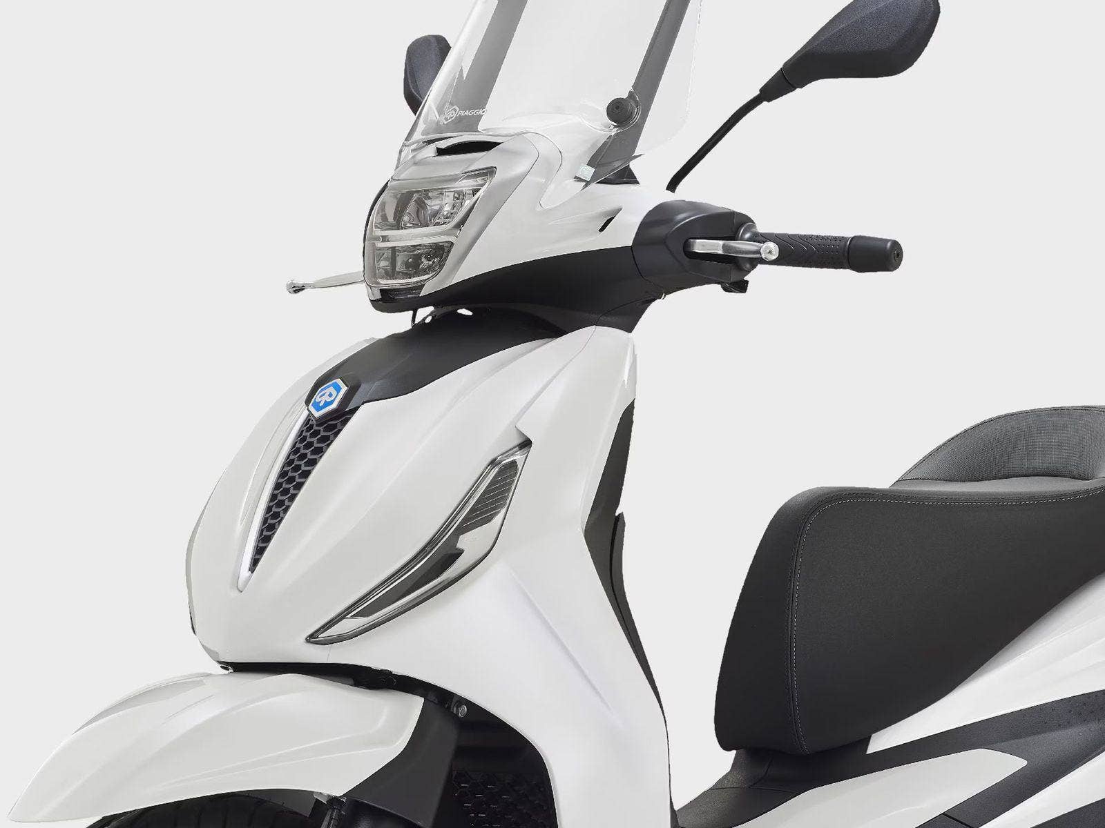 Piaggio Beverly je čistá elegance v pohybu. Jeho harmonické linie jsou dokonale doplněny kovovými detaily, které zvýrazňují prvky, jako jsou světlomety, přístrojová deska a kryt převodovky. Luxusní vzhled ještě podtrhuje sedadlo z dvojitého černého materiálu s kontrastním prošíváním, které navíc nabízí maximální pohodlí. Velká kola bez problémů zapadají do celkového štíhlého designu, zatímco přední štít s větracím otvorem ve tvaru V a mřížkou ve tvaru včelího plástu připomíná ikonickou „kravatu“ Piaggio a dodává skútru jedinečný a nezaměnitelný charakter.