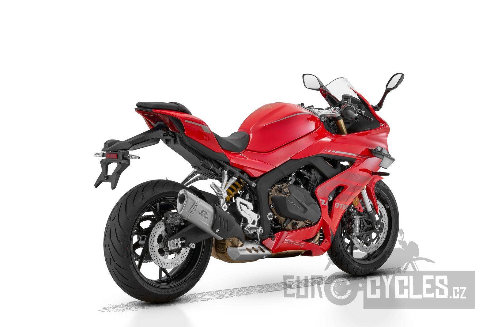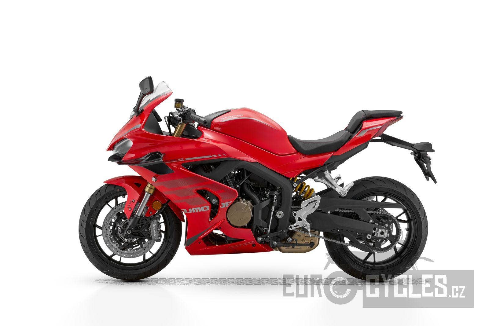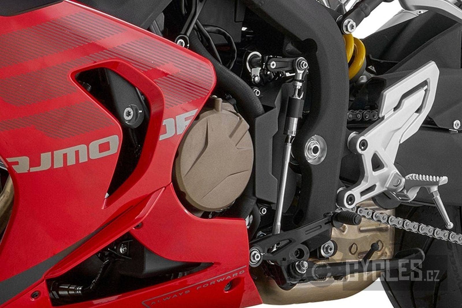 Každý silniční motocykl, který má ambice jezdit závody definuje především jeho motor. SRK 800 RR má řadový čtyřválec s rozvody DOHC se 16 ventily o objemu 778 ccm, generující výkon 95 koní a maximální točivý moment 75 Nm. S využitím náporového sání má motor špičkovou hodnotu výkonu dokonce 102 koní. Pro model 2026 je motor zásadně upraven. Nyní má mnohem silnější střední pásmo, na přidání plynu reaguje motor velmi silně a bez jakéhokoliv cukání. Výkon lineárně roste téměř až k omezovači. Nová řídící jednotka od Magneti Marelli zajištuje dokonalé dávkování paliva. Je třeba zmínit, že tento motor má velký potenciál co se týká ladění, protože v závodech světových supersportů má tato pohonná jednotka samozřejmě ještě vyšší hodnoty výkonu a kroutícího momentu. I sériový motor Vám však nabídne úžasné zrychlení, které tento špičkový motocykl z naší produkce nabízí.