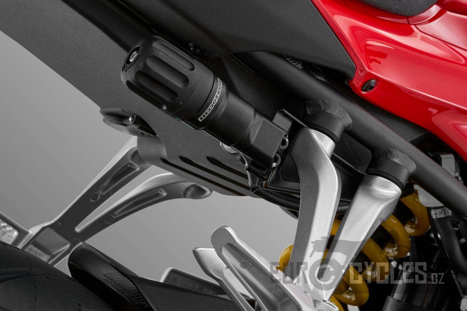 Kvalitní a pevné zadní odpružení je zásadní pro rychlou a bezpečnou jízdu. Jeho kvalita musí samozřejmě korespondovat s předními vidlicemi a vše musí podpořit i pevná kyvná vidlice. Zadní tlumič a jeho správné nastavení následně umožňují motocyklu při tvrdé akceleraci zachovat jezdci kontrolu nad svým motocyklem. SRK 800 RR má seriově montovaný zadní centrální tlumič Marzocchi, který všechny tyto požadavky splňuje. Navíc je vybavený externím nastavováním, díky kterému si jeho tuhost snadno nastavíte i bez pomoci nářadí.