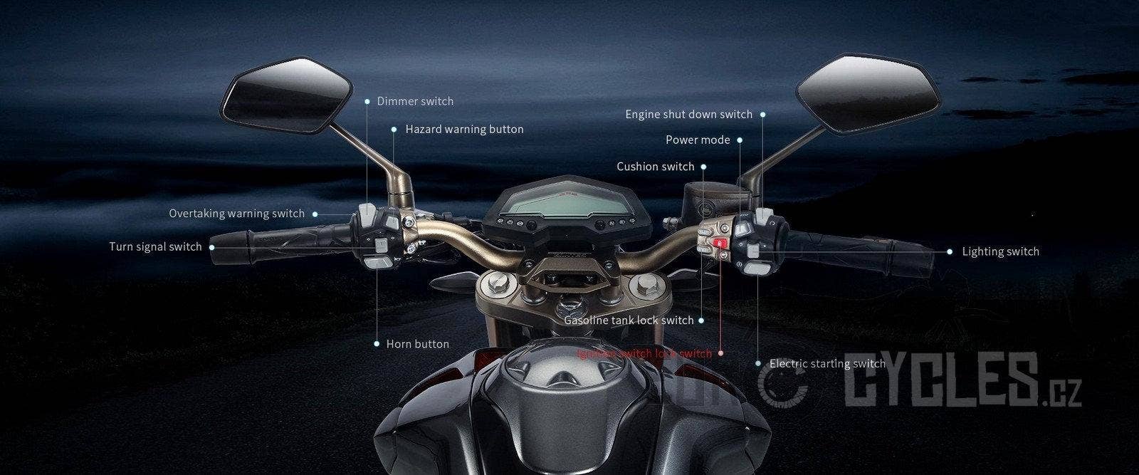 Dravá motorka s moderním vzhledem se dvěma režimy jízdy - ECO a SPORT. Startování a zabezpečení motocyklu plně elektronicky bez použití klíčku, s transpondérem s dosahem 1,5 metru. Do výbavy patří také velkokapacitní baterie, která poskytuje dostatečnou záruku pro startování v chladném počasí a využívání doplňků, jako je třeba USB nabíječka. Ta má dva USB porty a může dodávat vysoký proud 2,1 A pro nabíjení dvou zařízení USB současně. Samozřejmostí je kompletní LED osvětlení pro bezpečnou a přehlednou jízdu. LCD displej vám poskytne stručný a jednoduchý přehled o všech údajích. Díky válci motoru vyrobenému z čistého hliníku je vnitřní stěna válce tenká, takže teplo z válce je rychle odváděno pryč. Což přispívá k vyššímu výkonu. Galvanizovaná olejová nádrž zase zabraňuje ucpávání filtru oleje v důsledku rzi. Systém BOSCH ABS 9.1M umožňuje řidiči ovládat motocykl bez ohledu na to, jestli jedete v písku, dešti nebo sněhu. Systém ABS vám přinese jistotu. Zadní centrální tlumič využívá vestavěný zásobník naplněný vysokotlakým dusíkem ke snížení teploty hydraulického oleje při tlumení. Sedlo jezdce a spolujezdce je rozdělené ve sportovním stylu a jeho pohodlná výplň a potah zaručují příjemnější jízdu. Hliníková zadní kyvná vidlice díky kombinaci materiálů a speciálnímu procesu odlévání má nízkou hmotnost a dobrou tuhost. Do základní výbavy patří i chrániče nastavitelných páček.